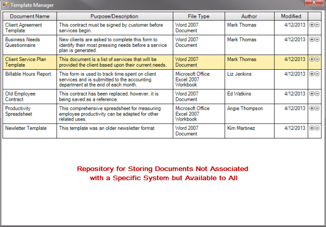 - Use the Template Manager to store document variations, obsolete documents you don’t want to discard, or frequently used document formats and templates.